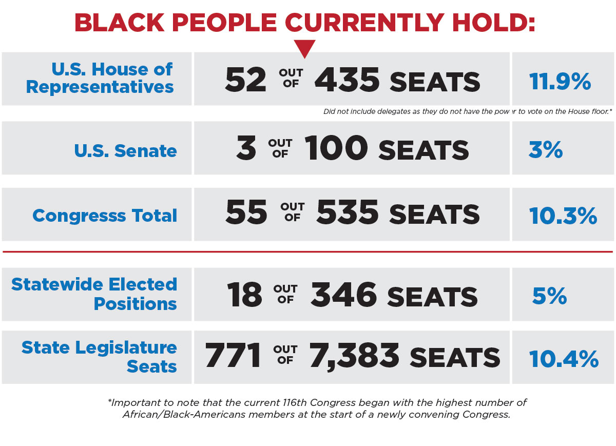 The Collective PAC is working to fix the challenge of under-representation of the Black community in elected seats of power throughout our nation. To reach political equity – a place where African American elected officials represent the community’s population statistically – Black elected officials should make up at least 13% of all elected officials in the U.S., at every level.
